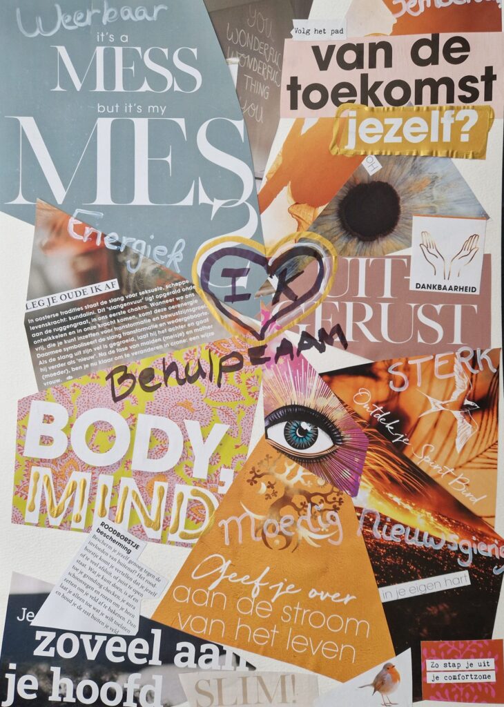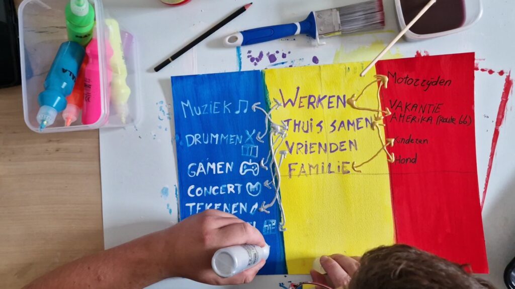 Ik schreef op wanneer ik kan ontspannen, wat ik belangrijk vind en wat ik spannend vind (maar nog wel wil proberen). Door dit te doen en via verf aan elkaar te koppelen heb ik nu op papier kunnen krijgen waar ik allemaal over denk en hoe de onderdelen in mijn leven met elkaar verbonden zijn."