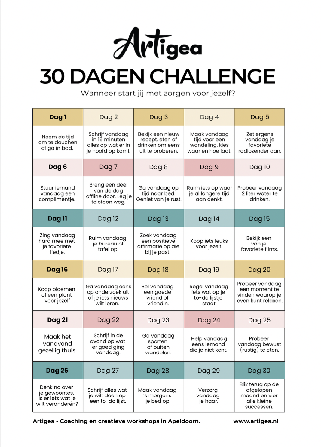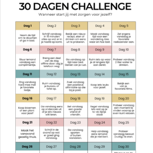 A4 formaat kalender van 30 dagen. Wordt het tijd dat je erkent dat je eigenlijk wel iets beter voor jezelf mag zorgen? Start dan in kleine stapjes. Deze agenda bestaat uit 30 opdrachten die gemakkelijk te doen zijn. Een mooie eerste stap om beter voor jezelf te gaan zorgen. Wees niet te streng vor jezelf. Sla je een dag over, dan ga je zodra je er klaar voor bent, gewoon verder.